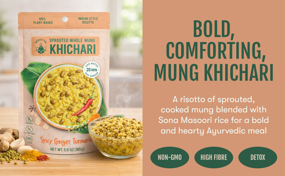 Moong Pani's Khichari is a unique blend of cooked sprouted mung and Sona Masoori rice, gently flavoured with turmeric, ginger and spices. Packed with protien, biotin, antioxidants and fibre - nutrients your body actually absorbs.