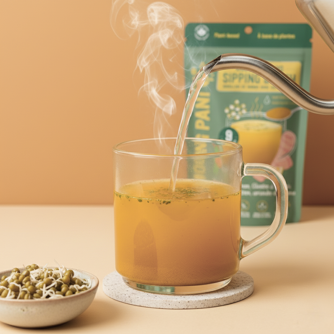 Moong Pani is an instant golden sipping broth made from sprouted whole mung beans, turmeric, and spices. Inspired by Ayurveda and backed by nutrition science, it's warm, savory, and gentle on the gut — a daily comfort in a cup.